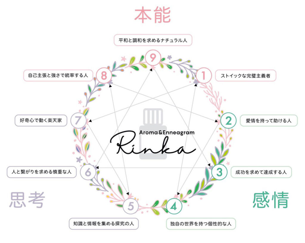 「エニアグラム」はギリシャ語の「9つの(ennea:エネア)」と「図(grammos: グラモス)」という言葉に由来し、人の性格を9つのタイプに分けて、円の円 周上の9カ所に配置して、図形で捉える心理学です。「エニアグラム(9つの図)」という名の示す通り、円の円周を九等分にして 1~9まで番号をふり、3-6-9を結んだ正三角形と、1-4-2-8-5-7 を結んだ変形六角形を重ね合わせた幾何学的図形を用いて、人の性格とその成長、そして人間関係を紐解いていきます。